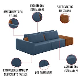 O Sofá Ilha 2 Lugares Living Lary de 272 cm é uma peça de destaque para qualquer ambiente, com um design moderno este sofá apresenta uma estrutura modular permitindo reorganizá-la criando um layout personalizado. Revestido no luxuoso tecido Veludo, proporcionando uma sensação de aconchego e sofisticação. Seu assento é fixo em espuma D-26 com multimolas de sustentação espiral e ensacadas, solda dupla, manta acrílica e percintas elásticas, suportando até 150 kg por assento. Já o encosto possui espuma D-23 sendo ele removível, com almofadas soltas preenchidas com 100% de fibra siliconada, proporcionando um apoio macio para as costas. Os pés são feitos em madeira certificando maior estabilidade ao móvel. Este sofá apresenta características de alta qualidade, incluindo uma estrutura de madeira tratada de eucalipto reflorestada, garantindo maior resistência e durabilidade ao produto, além de contribuir para a sustentabilidade ambiental. Com cinco assentos no total, um deles revestido em tecido Sintético Pu Nozes com detalhes em gomos feito com a técnica de costura pespontos, este sofá oferece espaço suficiente para acomodar confortavelmente até seis pessoas, tornando-o ideal para receber amigos e familiares com estilo e conforto. Pode ser utilizado em escritórios, restaurantes e demais ambientes corporativos.O Sofá Lary é a escolha perfeita para quem busca uma peça de mobiliário que une funcionalidade, conforto e estilo em uma única solução para o seu ambiente. Aproveite!