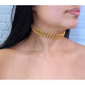 Colar rígido tipo gargantilha de aço em círculos dourados de design moderno, perfeito para qualquer ocasião. É feito de aço, o que o torna durável e resistente à água e ao desgaste. É hipoalergênico, o que o torna seguro para pessoas com pele sensível ou alergias.