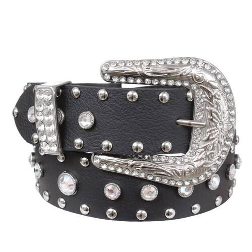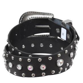 Cinto Feminino da nossa marca exclusiva Cow Way, fabricado em couro na cor Preto com 4cm de largura, possui rebites de metal, pedras strass super brilhantes e fivela com passador em metal trabalhada removível com pedras strass também.