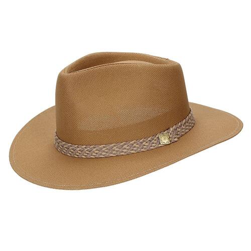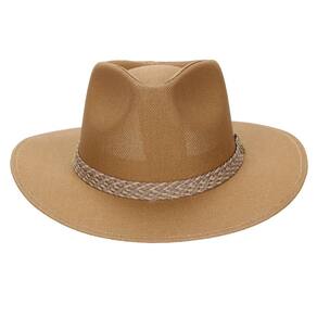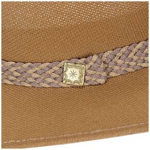 Chapéu Pralana modelo Melbourne, fabricado em tecido 100% algodão cor Marrom, aba de 7,5cm, copa de 11cm, banda em cadarço bicolor trançado, detalhes em boton de metal com banho dourado e carneira de espuma. Fino acabamento.