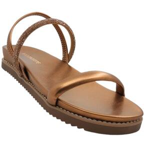 A tira coberta por strass adiciona um toque de brilho ao seu passo, fazendo você brilhar em cada ocasião. Com solado emborrachado e calce fácil, garantido pela tira elástica no calcanhar, esta sandália não só proporciona estilo, mas também segurança em cada passo, seja na cidade, na praia ou em qualquer aventura de verão.