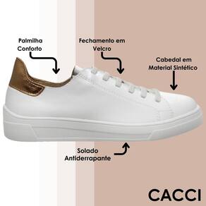 Praticidade no Uso: Com um sistema de fechamento prático, o Tênis Dourado Cacci é fácil de calçar e se ajusta perfeitamente aos seus pés.