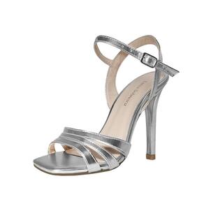 Linha de Sandália Salto Alto Fino Luiza Sobreira, produzida em material sintético na cor Prata, com palmilha e forro em P.U., solado em TR, bico quadrado e fivela ajustável para fechamento.