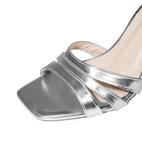 Linha de Sandália Salto Alto Fino Luiza Sobreira, produzida em material sintético na cor Prata, com palmilha e forro em P.U., solado em TR, bico quadrado e fivela ajustável para fechamento.