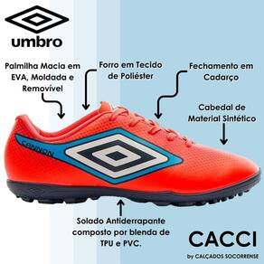 Com um design autêntico e ousado, a Chuteira Society Umbro Cannon é indicada para jogadores iniciantes que se destacam dentro do gramado sintético. O grafismo reticulado com efeito degradê traz personalidade e cores vivas no melhor estilo Umbro.