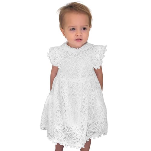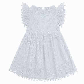 Feito em renda trabalhada, o vestido possui mangas curtas com acabamento em pompons, gola delicada e um caimento leve e confortável, proporcionando liberdade de movimento para a criança. O fecho discreto na parte traseira facilita na hora de vestir, garantindo praticidade e elegância.
