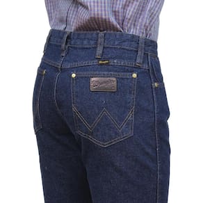 Calça Wrangler masculina modelo Cowboy Cut fabricada em tecido 100% Algodão na cor Azul Escura, possui 3 bolsos frontais e 2 traseiros em modelo tradicional, etiqueta no bolso e rebites personalizados.