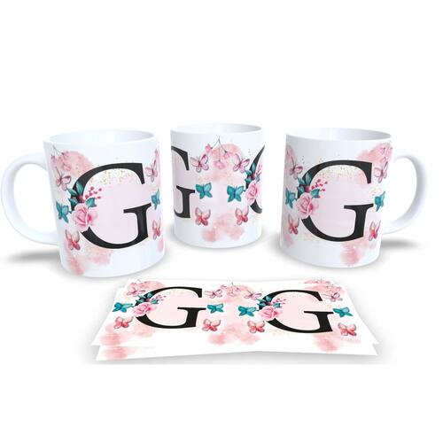 Caneca de porcelana de alto brilho, com alça e interior branca Coleção Alfabeto Iniciais Nomes.
