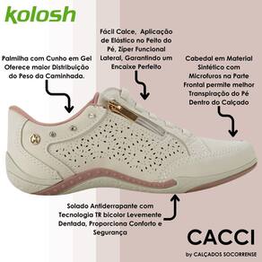 De calce fácil, traz elásticos e um zíper funcional lateral, para melhor ajuste e conforto, além de pequenos microfuros na região frontal, permitindo melhor transpiração do pé no calçado. Conta também com a tecnologia da palmilha com cunho em gel, com maior absorção de impacto durante a pisada, atuando na melhor distribuição do peso e auxiliando na postura corporal.