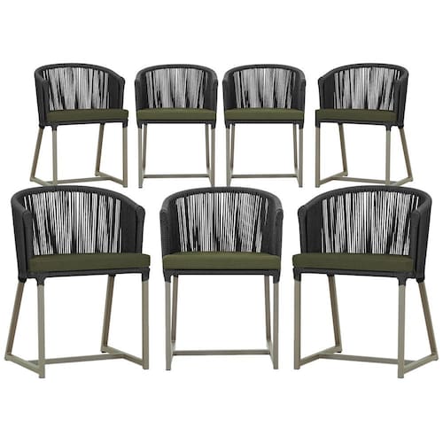 Combinando estilo e resistência, esta cadeira traz o melhor do design contemporâneo em alumínio com micro pintura e acabamento em corda náutica. O estofado impermeável completa o conforto e a funcionalidade, tornando-a ideal para ambientes externos e internos.