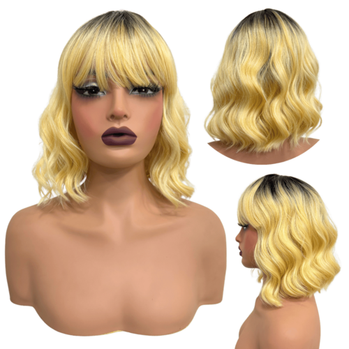 Peruca curta c/ franja ondulada ombre orgânica premium 25cm - Cor: Loiro ombre gold