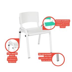 Características do produto: - Estrutura resistente: Pés e encosto em tubo oblongo de 0,90 mm, proporcionando estabilidade e segurança. - Pintura eletrostática: Maior durabilidade e resistência contra corrosão. - Assento e encosto em plástico: Combinando com diferentes ambientes. - Capacidade de carga: Suporta até 50 kg. - Conforto garantido: Formato anatômico para melhor adaptação ao corpo infantil.