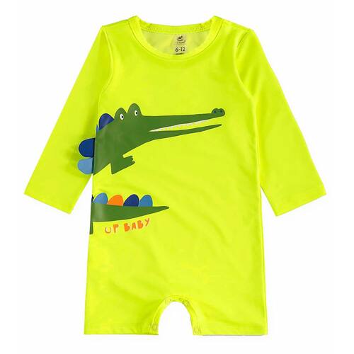 O Macaquinho de Praia Bebê e Infantil com estampa de Jacaré Amarelo Flúor Up Up Baby é confeccionado em Malha Poliéster com proteção solar UV FPS +50. Possui abertura entre as pernas para facilitar a troca e o vestir e o charme fica por conta do aplique de escamas na lateral.