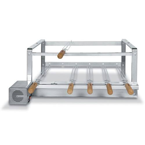 Suportes em AÇO INOXIDÁVEL para churrasqueiras de alvenaria, com espetos que giram em rotação constante, acionados por motor elétrico bivolt.