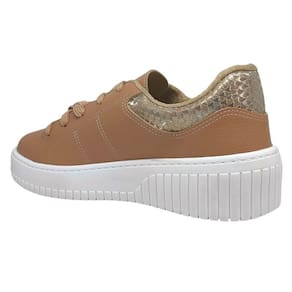 O fechamento em cadarço ajustável com detalhe metalizado não apenas garante segurança e firmeza ao caminhar, como também reforça o visual sofisticado do modelo. O interior acolchoado e a palmilha extremamente macia oferecem uma experiência de uso confortável do início ao fim, mesmo em rotinas agitadas. Além disso, o solado flatform de quatro centímetros contribui para uma postura mais estável e elegante, enquanto a base antiderrapante proporciona segurança e aderência em diversos tipos de piso.