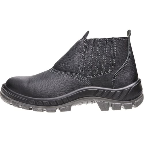 Especificações técnicas -Material do cabedal: couro vaqueta preto -Fechamento: elástico lateral para ajuste rápido -Biqueira: aço ultrarresistente contra impactos -Palmilha: aço com montagem em poliéster resinado -Solado: PU bidensidade injetado direto no cabedal, isolante e antiderrapante -Forração interna: tecido com tratamento antibacteriano