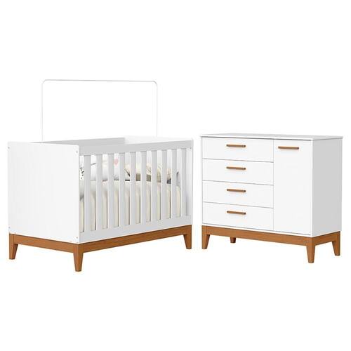 O Jogo de Quarto Infantil Flip foi pensado para oferecer praticidade, segurança e beleza ao ambiente do bebê. A cômoda é produzida em MDF com pintura UV atóxica, conta com 1 porta com dobradiças metálicas e prateleira móvel, 4 gavetas com corrediças telescópicas, puxadores revestidos, tampo com cantos arredondados, sistema antitombamento e pés de madeira. Já o berço americano, que se transforma em mini cama, possui estrutura em MDF com acabamento fosco, cabeceira arredondada, grade em madeira, 3 regulagens de altura no estrado, pés em madeira e certificado do INMETRO. Compatível com colchão de 70 x 130 cm (não incluso), é a escolha ideal para acompanhar cada fase do seu pequeno com conforto e estilo.