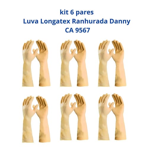 Kit 06 pares Luva Longatex CA 9567 Proteção Eficiente para Mãos e Antebraços A luva Longatex é confeccionada em látex natural e possui punho longo, proporcionando proteção eficaz para mãos e antebraços em diversas atividades. Seu design com palma e dedos antiderrapantes garante segurança no manuseio de objetos, mesmo em ambientes úmidos.