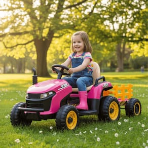 O diferencial dele é seu trailer destacável e basculante. As crianças podem transportar brinquedos, areia, folhas ou pequenos objetos, descarregando tudo com facilidade apenas inclinando o reboque. Com um simples toque, ele retorna automaticamente à posição inicial. Além disso, o trailer pode ser removido soltando apenas um parafuso, transformando o trator em um veículo compacto de quatro rodas, ideal para brincar em espaços menores e para facilitar o armazenamento.