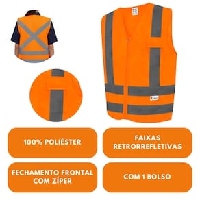 - Tecido 100% poliéster - Fechamento frontal em zíper - Visibilidade em 360° graus - Faixas retrorrefletivas - Visibilidade mesmo em longas distâncias
