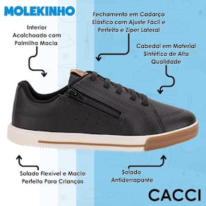 O Sapatênis Infantil Molekinho foi criado para acompanhar o ritmo cheio de energia das crianças, oferecendo conforto, praticidade e um visual moderno que agrada pais e pequenos. Cada detalhe do modelo foi pensado para tornar o dia a dia mais leve, desde o calce descomplicado até a segurança em cada passo.