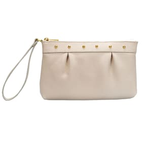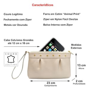 Bolsa clutch, carteira de mão e porta celular em COURO, delicada, elegante, moderna e prática, possui 1 bolso interno fechado por zíper para pequenos objetos, todos os metais (argola, mosquetões, zíperes, etc) são na cor dourada. O fechamento principal é feito com zíper em nylon de fácil deslize. Possui alça fixa externa de mão. Ela tem a medida ideal para levar pequenos objetos, carteiras pequenas, celulares de tamanhos médio e grande, etc.