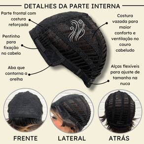 - Tamanho da peruca M (padrão) com alças internas ajustáveis.