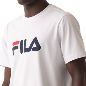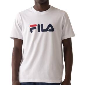 Camiseta masculina feita em algodão com certificações OEKO-TEX e BCI. Possui modelagem regular, gola em ribana, barra com fendas laterais e pesponto duplo nos acabamentos. A estampa FILA Linear em silk na parte frontal destaca o logo da marca, unindo sustentabilidade e estilo básico.