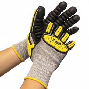 Luva de segurança confeccionada em fibras sintéticas e HPPE, 13 gauge, aplicação de protetores de impacto TPR na região dorsal, revestimento palmar, pontas e face palmar dos dedos em borracha foam (espuma) em formato de gomos.