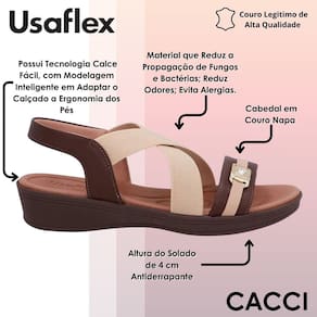 A sandália Usaflex é a combinação perfeita entre conforto, elegância e tecnologia. Desenvolvida para quem busca bem-estar durante todo o dia, ela conta com tecnologia de calce fácil e modelagem inteligente, que se adapta à ergonomia dos pés, proporcionando encaixe natural e sensação de leveza a cada passo.
