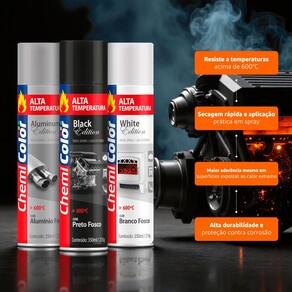Ideal para quem busca uma tinta spray de alta performance, a Chemicolor Alta Temperatura suporta até 600°C, perfeita para aplicações em superfícies que sofrem com calor extremo, como escapamentos, motores, churrasqueiras e equipamentos industriais. Sua fórmula de secagem rápida garante praticidade e acabamento fosco de alta durabilidade, disponível nas cores Alumínio Fosco e Preto Fosco.