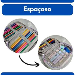 Organização Interna: Possui dois compartimentos principais que se abrem como um livro, revelando elásticos fixos para até 24 lápis/canetas e um prático bolso em tela (mesh) para pequenos acessórios.