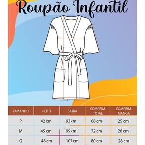 Os roupões são estampados, bordados e com capuz, confeccionados em tecido felpudo 100% algodão, garantindo excelente absorção e toque suave e carinhoso à pele do bebê. Possuem amarração nas laterais, para melhor ajuste e segurança.