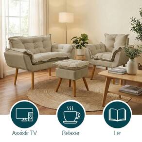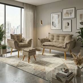 Fabricado com madeira maciça de eucalipto, o Kit Alice garante durabilidade e resistência. O assento e encosto possuem enchimento em fibra mista, proporcionando maciez e conforto excepcionais. Revestido em tecido suede, oferece um toque macio e sofisticado. Seus pés, em madeira na tonalidade castanho, possuem design moderno e estável, trazendo charme e elegância ao ambiente. Com capacidade para até 120 kg na poltrona e namoradeira, e 100 kg no puff, é a escolha ideal para quem busca qualidade, conforto e estilo.