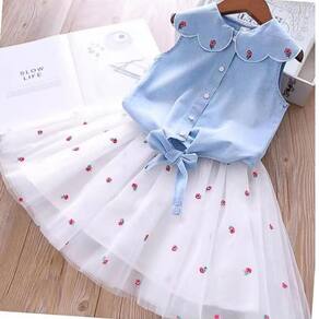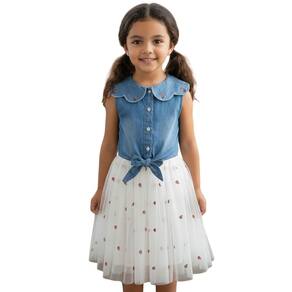 Vestido infantil encantador, ideal para ocasiões especiais e uso diário com conforto. Possui corpo com fechamento em botões, gola delicada e detalhe de laço na cintura. A saia em tule com bordados traz leveza e movimento, garantindo um visual alegre e elegante. Modelagem confortável que permite liberdade para brincar e passear.