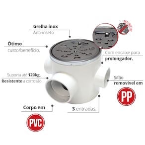 Benefícios do Produto: • Em conformidade com a norma NBR 5688 e NBR 8160. • Sifão em PP removível e corpo em PVC. • Ótimo custo/benefício. • Com encaixe para prolongamento. • Grelha produzida em aço inoxidável. • Alto padrão de acabamento. • Alta resistência e fácil instalação. • Material resistente à corrosão. • Fecho que impossibilita o retorno de insetos. • Suporta até 120 kg.