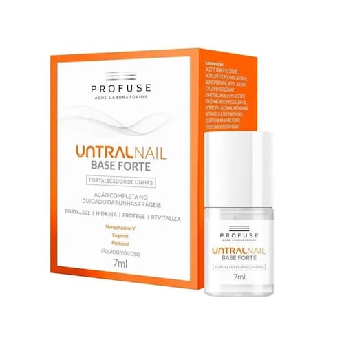 Profuse Fortalecedor De Unhas Untralnail Base Forte 7ml Conta com o exclusivo ativo Nonychosine V, um complexo de átomos que atua de forma seletiva, proporcionando uma recuperação homogênea das unhas. Além disso, possui outros ativos como Eugenol e Pantenol que, em sinergia, promovem uma melhora no fortalecimento, resistência, hidratação e restauração das unhas.