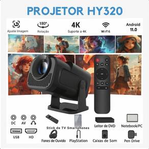 Características: Desempenho visual excepcional: imagens incrivelmente nítidas e vibrantes em uma tela expansiva de até 170 polegadas. Conectividade avançada: wi-fi 5g para uma conectividade rápida e estável, sistema android 11 integrado para acesso a uma variedade de aplicativos e serviços de streaming. Design portátil e leve: com apenas 1kg de peso, o projetor hy320 é incrivelmente portátil, ideal para todas as ocasiões.