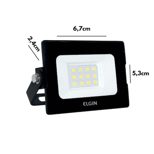 PROJETOR LED ELGIN REFLETOR 10W 6500K BIVOLT Design diferenciado, grande capacidade de dissipação de calor, modelo refletor mais fino (“Slim”) Características Principais:Luminária LED, tipo projetor, na cor preta, com dispositivo de controle incorporado, embalagem tipo caixa, material empregado: alumínio, Led SMD, vidro temperado e diversos componentes eletrônicos, potência de 10 Watts, fluxo luminoso de 550 lúmens, eficiência de 55 LM/W, temperatura de cor de 6500 KelvinEspecificações:Potência (W): 10Tensão (V): 100-240VFrequência: 50/60HzFluxo Luminoso (lm): 550Temperatura de Cor: 6500KVida Útil: 25.000hIRC: 70Eficiência Luminosa (lm/W): 55Ângulo de Facho 120°IP: 65Nicho (mm): n/aEquivalência: 100WPotência (W): 10 Dimensões: 675x53.5x24.5mm*Imagens Ilustrativas**Garantia: 1 Ano*