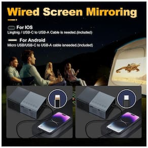 Suporta distâncias de projeção mínima de 1,3 m e máxima de 20 m, com montagem em mesa. Nota: devido a HDCP, espelhamento de apps protegidos requer TV Stick, Roku ou Chromecast via HDMI (adaptadores Lightning/Micro USB/Type-C não inclusos).