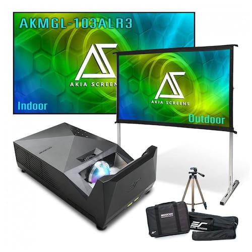 O kit de projeção da AKIA SCREENS combina o projetor ultra short throw MosicGO Full HD com uma tela fixa interna CLR3 de 103" e uma tela portátil externa de 58", oferecendo uma solução completa para home theater em sala e projeção móvel em ambientes internos ou externos. O projetor utiliza tecnologia DLP com resolução nativa 1920 x 1080, brilho de 1000 lúmens ANSI, contraste de 20.000:1 e fonte de luz LED OSRAM com vida útil de 25.000 horas, ideal para imagens grandes em ambientes com iluminação controlada.
