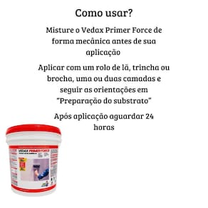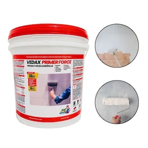 Promotor aderência vedax primer force 5kg tinta piso azulejo Vedax primer force - ponte de aderência de alto desempenho Transforme qualquer superfície em uma base segura, resistente e com excelente aderência Vedax primer force é um promotor de aderência monocomponente que cria uma camada firme, com acabamento áspero, ideal para aumentar a adesão química e mecânica em uma ampla variedade de substratos. Também atua como endurecedor de superfície, recuperando pisos e rebocos deteriorados, aumentando sua resistência à abrasão. Principais aplicações: Paredes em reboco novo ou repintura Lajes, coberturas, marquises, beirais Pisos cerâmicos, porcelanatos, madeira, vidro e metal com preparo adequado Chapisco rolado sobre alvenaria, concreto, eps, etc. Pisos e rebocos desgastados ou soltando pó Como primer para impermeabilização ou aplicação de texturas Vantagens do vedax primer force: Aceita assentamento direto de pisos Cria ponte de aderência em superfícies lisas ou porosas Substitui o selador comum com mais desempenho Melhora a resistência e coesão da superfície Produto ecológico, sem solventes e com baixo voc Pode ser em áreas internas e externas Absorve fissuras de retração e aceita estagnação de água Rendimento aproximado: Substratos porosos: 300g a 500g por m diluído de 10 a 20% Substratos lisos: 150g a 300g por m diluído de 10 a 20% Metais: 150g a 300g por m sem diluição Como usar: Limpe a superfície, removendo poeira, graxa, óleo ou tinta solta Dilua a primeira demão em até 20% de água limpa Aplique com rolo, trincha ou vassoura de cerdas suaves A segunda demão deve ser feita sem diluição Aguarde o tempo de cura antes de seguir com a próxima etapa: 6 horas para rebocos e concretos 24 horas para pisos lisos como cerâmica e vidro 72 horas para assentamento de pisos sobre a base tratada Importante: Não aplique em superfícies úmidas ou com umidade ascendente Não usar em locais com pressão negativa de água Ferramentas devem ser lavadas com água logo após a aplicação Apresentação: Embalagens de 1kg, 5kg ou 20kg Composição: Resina elastomérica, água, cargas minerais e aditivos especiais Marca: Não Informado Ean: 7897523157303