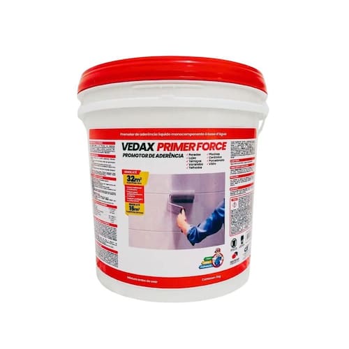 Promotor aderência vedax primer force 5kg tinta piso azulejo Vedax primer force - ponte de aderência de alto desempenho Transforme qualquer superfície em uma base segura, resistente e com excelente aderência Vedax primer force é um promotor de aderência monocomponente que cria uma camada firme, com acabamento áspero, ideal para aumentar a adesão química e mecânica em uma ampla variedade de substratos. Também atua como endurecedor de superfície, recuperando pisos e rebocos deteriorados, aumentando sua resistência à abrasão. Principais aplicações: Paredes em reboco novo ou repintura Lajes, coberturas, marquises, beirais Pisos cerâmicos, porcelanatos, madeira, vidro e metal com preparo adequado Chapisco rolado sobre alvenaria, concreto, eps, etc. Pisos e rebocos desgastados ou soltando pó Como primer para impermeabilização ou aplicação de texturas Vantagens do vedax primer force: Aceita assentamento direto de pisos Cria ponte de aderência em superfícies lisas ou porosas Substitui o selador comum com mais desempenho Melhora a resistência e coesão da superfície Produto ecológico, sem solventes e com baixo voc Pode ser em áreas internas e externas Absorve fissuras de retração e aceita estagnação de água Rendimento aproximado: Substratos porosos: 300g a 500g por m diluído de 10 a 20% Substratos lisos: 150g a 300g por m diluído de 10 a 20% Metais: 150g a 300g por m sem diluição Como usar: Limpe a superfície, removendo poeira, graxa, óleo ou tinta solta Dilua a primeira demão em até 20% de água limpa Aplique com rolo, trincha ou vassoura de cerdas suaves A segunda demão deve ser feita sem diluição Aguarde o tempo de cura antes de seguir com a próxima etapa: 6 horas para rebocos e concretos 24 horas para pisos lisos como cerâmica e vidro 72 horas para assentamento de pisos sobre a base tratada Importante: Não aplique em superfícies úmidas ou com umidade ascendente Não usar em locais com pressão negativa de água Ferramentas devem ser lavadas com água logo após a aplicação Apresentação: Embalagens de 1kg, 5kg ou 20kg Composição: Resina elastomérica, água, cargas minerais e aditivos especiais Marca: Não Informado
