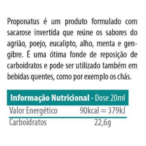 Propo Natus 300Ml Propo natus é uma fonte de carboidrato, a base de sacarose invertida sabores agrião, poejo, gengibre, eucalipto, alho e menta. A mistura dos extratos de agrião e eucalipto ao com altos teores de própolis, potencializa a ação preventiva e curativa da própolis e é recomendado como potente nas tosses com catarro e em bronquites. O com própolis, agrião e eucalipto é um excelente e combate com eficácia a tosse, pois une o agrião, há muito tempo utilizado na alimentação e tradicionalmente reconhecido pela sua ação fluidificante das vias respiratórias, o eucalipto que age como anti-séptico das vias respiratórias e a própolis, um antibiótico natural. A presença do proporciona um sabor agradável e beneficia o organismo com suas propriedades. Instruções de Uso Modo de Preparo Ingerir 10mL 1 colher de sopa 2 vezes ao dia. Produto enviado com Validade Apta para o Consumo. Importante Saber Diabéticos: contém açúcar. O Ministério da Saúde adverte: Não existem evidências científicas comprovadas de que este alimento previna, trate ou cure doenças. Pessoas que apresentem doenças ou alterações fisiológicas, mulheres grávidas ou amamentando nutrizes deverão consultar o médico antes de usar o produto. Isento de registro M.S. Conforme RDC 27/2010 Ean: 7899468504785