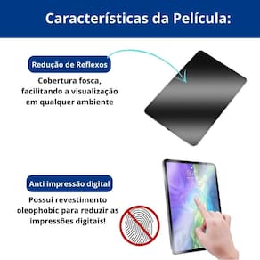 - sem impedimentos ao toque Por ser uma película que adere 100% a tela é de extrema qualidade, o toque permanece suave como se não houvesse película de proteção. Mantendo a sensibilidade com as mãos ou até mesmo com a caneta touch