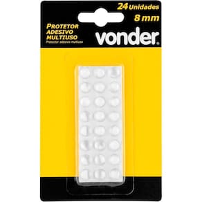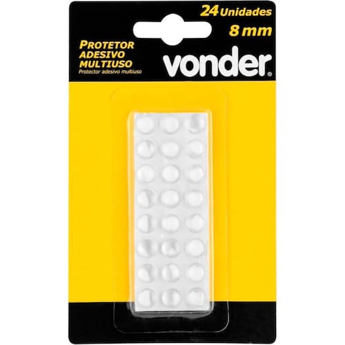 Marca: VonderConteúdo da embalagem: 1 Cartela com 24 peças.Destaques e diferenciais:Fabricado em PVC.Dicas de uso:Indicado para proteção de móveis, eletrônicos, entre outros. Contra riscos, batidas e deslizamentos. Ideal para apoio de tampos de vidro em mesas, para proteção de paredes em contato com maçanetas ou outros objetos, e para evitar o impacto entre duas superfícies gavetas, tampos, entre outros .Detalhes Técnicos:Formato do autoadesivo: Redondo Cor: Transparente Material: PVC Dimensões: Diâm. X esp.: 8 mm x 2,5 mm Ean: 7893946676766