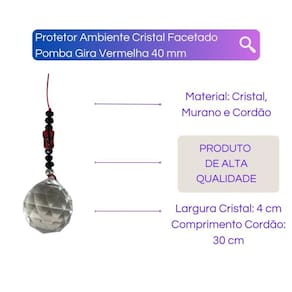 Protetor ambiente cristal facetado pomba gira vermelha 40 mm cristal facetado 40 mm transparente e 8 contas de cristal 6 mm vermelho para pendurar com argola e cordão de 30 cm. O cristal multifacetado é indicado para corrigir a energia na planta de qualquer ambiente. É utilizado pela técnica de feng shui para corrigir fluxos energéticos e curar doenças de uma casa. O cristal pode ser utilizado para curar faltas de áreas de uma planta de acordo com o feng shui, pode ser colocado no batente superior da porta do banheiro para amenizar a corrente energética que sai dele, quando esse banheiro fica de frente para o quarto ou é de uma suíte. Use esse cristal também no ponto central de um corredor que não tem iluminação suficiente, que não tem luz ou que seja maior que 3 metros. Dimensões aproximadas: comprimento: 4 cm largura: 4 cm altura: 4 cm peso aproximado da peça: 80 g embalagem de envio: caixa de papelão ondulado, plástico bolha, conforme necessidade do produto. Respostas das dúvidas mais frequentes na ordem: r1: já realizamos milhares de entregas em todo o brasil, somos especialistas no que fazemos. R2: assim que seu pedido for despachado, esta plataforma envia para você o código de rastreamento. R3: enviamos o produto 100% inspecionado e conferido em nosso checkout e são embalados em embalagem de papelão e plástico bolha. R5: iremos despachar o seu produto o mais rápido possível, assim que for confirmado pela plataforma, enviamos em até 24h. R6: nós queremos a sua satisfação, qualquer problema iremos te auxiliar em nossos canais de comunicações. Marca: Lua Mística - 100% Original - Loja Oficial