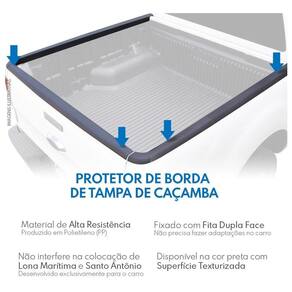 Fabricado em plástico polietileno, protege a borda da caçamba contra pequenas batidas, riscos ou manchas. Produto de fácil instalação pois é fixado com cola dupla face da 3m,basta limpar bem o local onde será fixada a peça, Não impede em nada sua instalação junto com santo antonio ou capota marítima