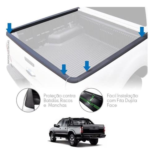 Fabricado em plástico polietileno, protege a borda da caçamba contra pequenas batidas, riscos ou manchas. Produto de fácil instalação pois é fixado com cola dupla face da 3m,basta limpar bem o local onde será fixada a peça, Não impede em nada sua instalação junto com santo antonio ou capota marítima