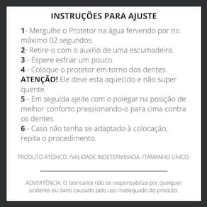 Um protetor bucal básico/ simples moldável para arcada dentaria superior . o protetor bucal deve ser moldado antes do uso. Não deve ser antes da moldagem Desenhado para se encaixar perfeitamente na boca, proporciona proteção para a arcada dentária superior - compacto e resistente. - feito em e.V.A - material não toxico - fácil de moldar - marca spank. Instruções de como moldar acompanha na embalagem Marca: Não Informado